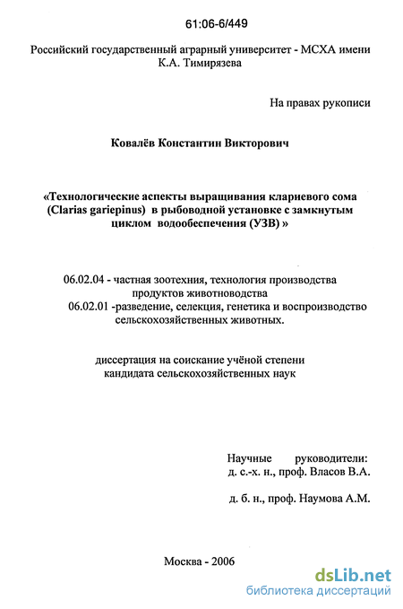 Технологические аспекты выращивания клариевого сома (Clarias gariepinus) в рыбоводной установке с замкнутым циклом водообеспечения (УЗВ) dslib.net Библиотека диссертаций Навигация Для нормальной работы сайта необходимо включить JavaScript → → Технологические аспекты выращивания клариевого сома (Clarias gariepinus) в рыбоводной установке с замкнутым циклом водообеспечения (УЗВ) Ковалев Константин Викторович Диссертация - 15у.е., доставка 10 минут, круглосуточно, без выходных и праздников Автореферат - 6 у.е., доставка 1-3 часа, с 10-19 (Московское время), кроме воскресенья Ковалев Константин Викторович. Технологические аспекты выращивания клариевого сома (Clarias gariepinus) в рыбоводной установке с замкнутым циклом водообеспечения (УЗВ) : диссертация ... кандидата сельскохозяйственных наук : 06.02.04, 06.02.01.- Москва, 2006.- 132 с.: ил. РГБ ОД, 61 06-6/449 Содержание к диссертации Введение 4Глава 1. Обзор литературы 9Современное состояние рыбоводства в установках с замкнутым циклом водообеспечения 9 Влияние температурного фактора на организм рыб 25 1.3. Африканский клариевый сом - перспективный объект то- 32 варного выращивания в УЗВ Биология, экология и физиология 33 Технологии воспроизводства и выращивания клариево- 37 го сома Глава 2. Материал и методы исследований 46Глава 3. Результаты собственных исследований 573.1. Получение потомства молоди сома методом искусственно го воспроизводства 57Содержание маточного поголовья. 57 Получение половых продуктов. 58 Оплодотворение икры 60 Инкубация икры. 61 3.1.5. Выдерживание личинок и переход их на активное 63 питание.Выбор оптимальной плотности посадки для выращивания товарного клариевого сома 65 Влияние астатичных температурных режимов на эффективность выращивания клариевого сома 68 3.3.1. Выбор оптимального астатичного терморежима привыращивании клариевого сома 68Рост сомов, эффективность использования корма. 69 Интенсивность потребления рыбой кислорода 79 3.3.2. Выращивание клариевого сома при оптимальном аста- тичном терморежиме 83Рост и эффективность использования корма 84 Экстерьерная характеристика тела рыб и их химический состав 86 3.4. Эколого-физиологические исследования рыб при подго- 91 товке к воспроизводству и товарном выращива нии 3.4.1. Изучение экологических условий и физиологических показателей сомов, содержащихся в аквариальных условиях 91 при подготовке к воспроизводству....Гидрохими